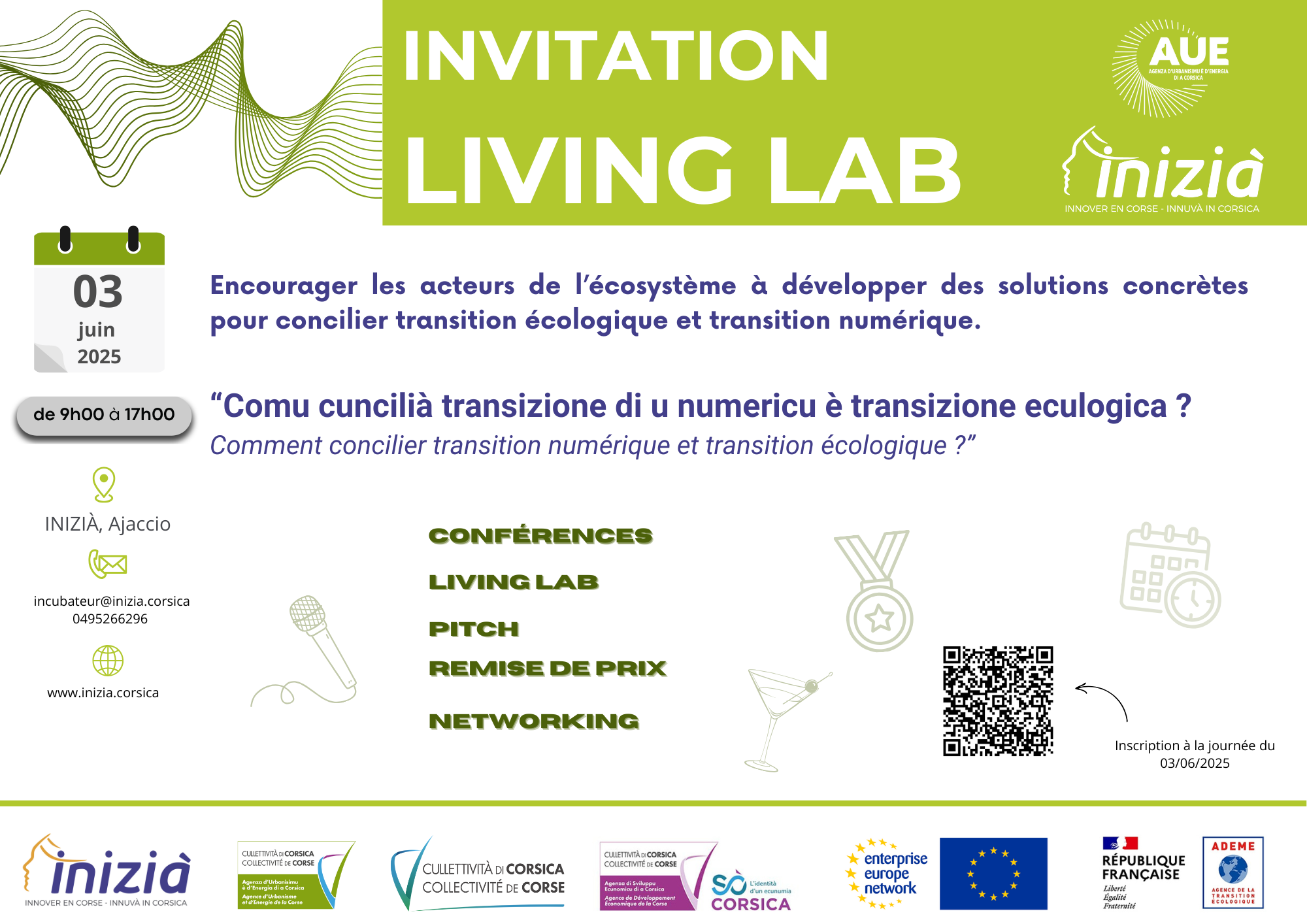 L’incubateur territorial d’entreprises innovantes de Corse - INIZIÀ, en partenariat avec l’Agence de l’Urbanisme et de l’Énergie (AUE), organisent un living lab : “Comment concilier transition numérique et transition écologique ?”, qui se tiendra le mardi 03 juin 2025 de 9h00 à 17h00 dans les locaux d’INIZIÀ à Ajaccio.
