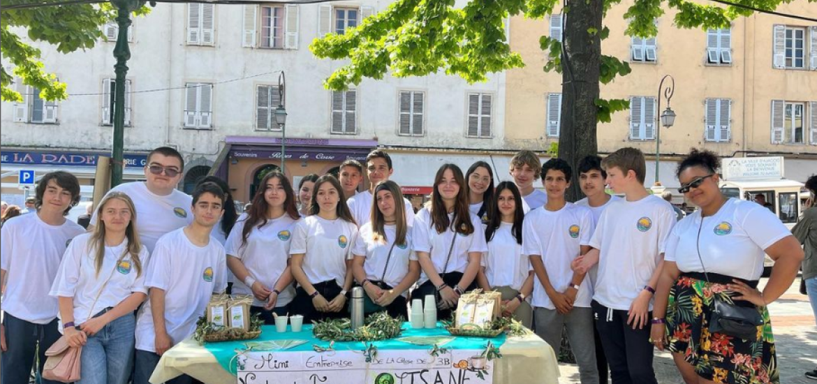 Le challenge choisit par la classe de 3ème B du Collège Pascal Paola d’Île Rousse pour la Mini-Entreprise® qui a bénéficié du mentorat de Léa Giudicelli, chargée de mission en alternance chez INIZIÀ : créer et développer du thé à base de feuilles d’oliviers.